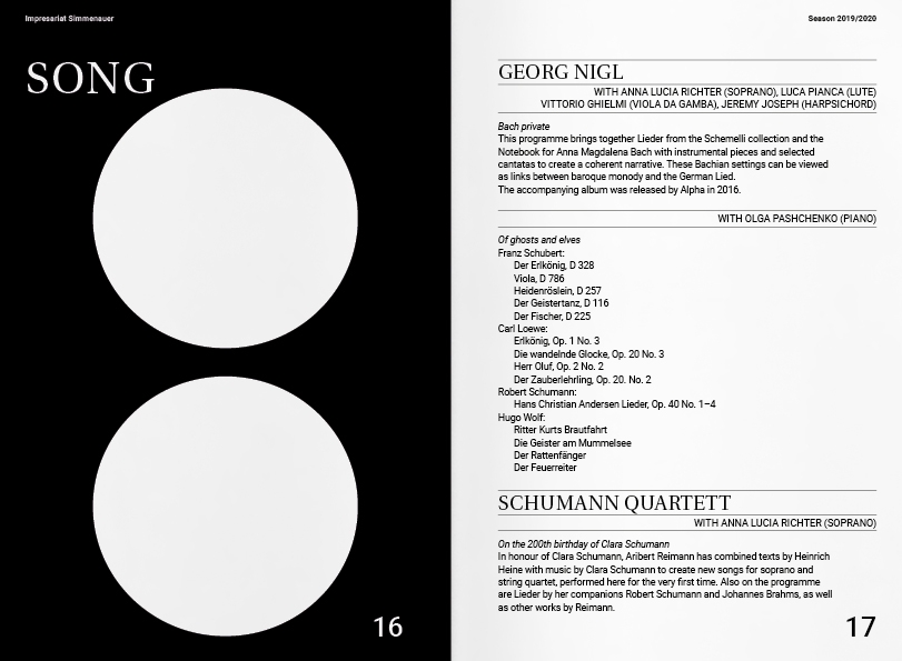 Creative Direction, Editorial DesignImpresariat Simmenauer is an agency for classical musicians with a rich heritage but also a progressive strategy, representing artists like Brandt Brauer Frick. Studio von Monkiewitsch were commissioned to design a new logo and a corporate identity for the agency. Evolving into a family business with the recent entry of Sonia Simmenauer’s son, the new visual identity strives to be an update that reflects the forward-looking and thinking of the agency. We took the old clef logo as the origin for the new logo and reduced it to just the dots - like a familiar tune with a new beat. The minimal language of the logo allows for flexible use, as our designs of their seasonal leaflet, letterhead and business cards show.